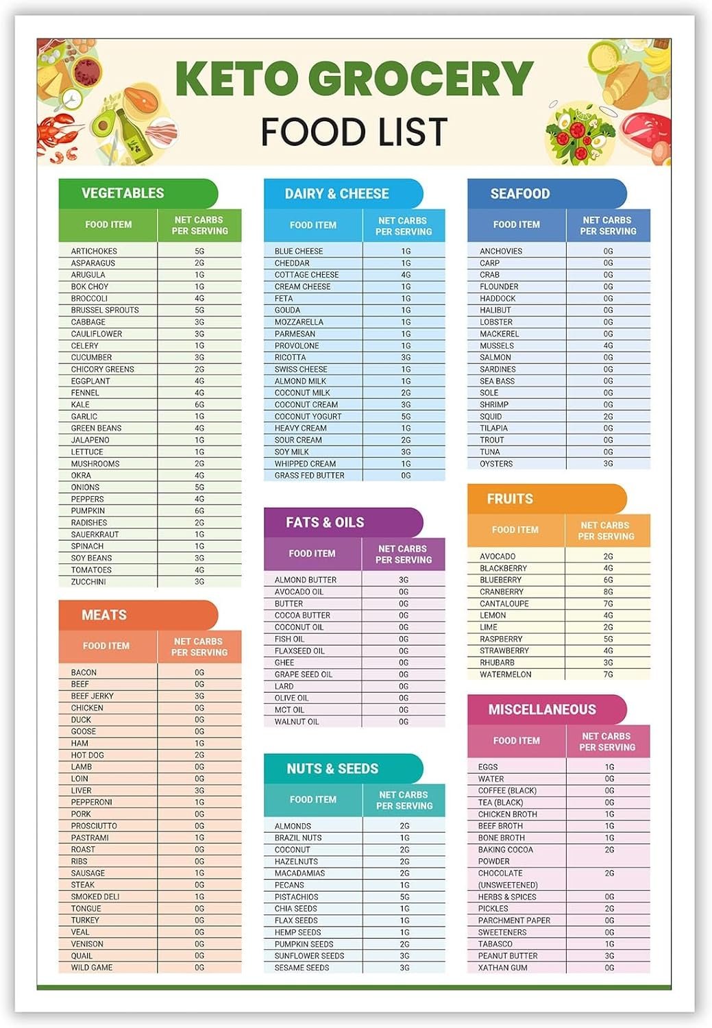 The reference chart features a comprehensive list of low-carb foods, covering proteins, fats, vegetables, and more. This invaluable resource helps you make informed dietary choices and stay on track with your keto diet.